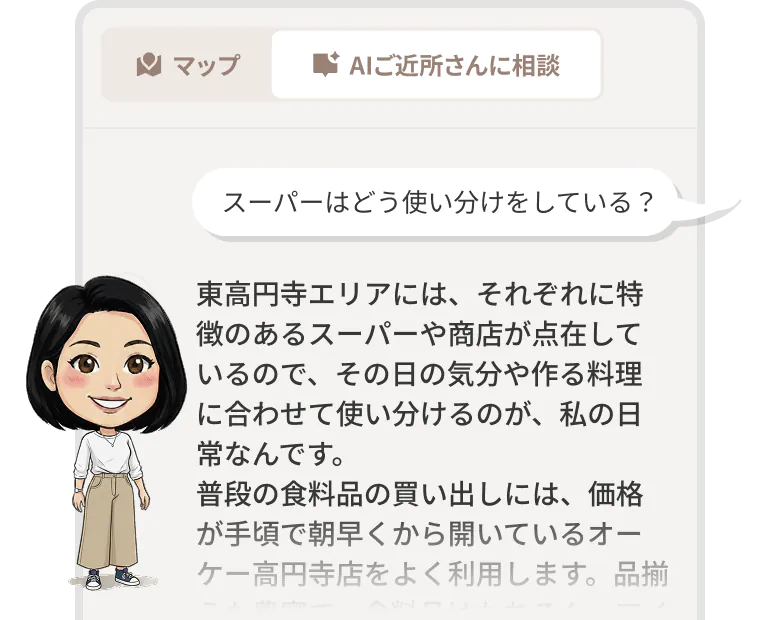 - 本サービスの情報は、実際の地域住人の声をベースとし、AIが入力内容に基づき自動生成したものです。そのため、一部誤ったあるいは最新ではない情報が含まれる可能性があります。